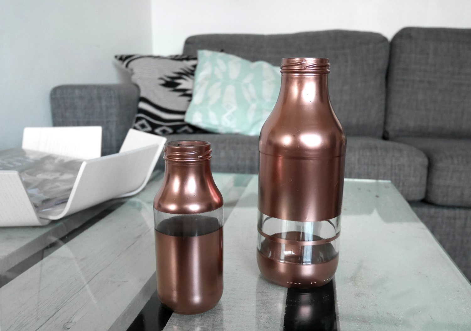 Kaapin pohjalla oli jo jonkin aikaa pyörinyt Frooshin smoothie-pulloja, joille olin miettinyt uusiokäyttöä. Yksi päivä töissä myymälän puolella pyöriessä törmäsin kuparimaaliin automaaliosastolla, muistin pullot ja siitä se ajatus sitten niin sanotusti lähti. Purkki kassan kautta kotiin ja maalaushommiin. Koska halusin pulloihin jotain twistiä, niin teippailin maalarinteipillä kumpaankin pulloon raidat. Nämä kohdat jäi maalailun jälkeen läpinäkyviksi ja katkovatkin kivasti klassista linjaa. Perusklassinen kun ei ole ihan suoranaisesti mun juttuni.
